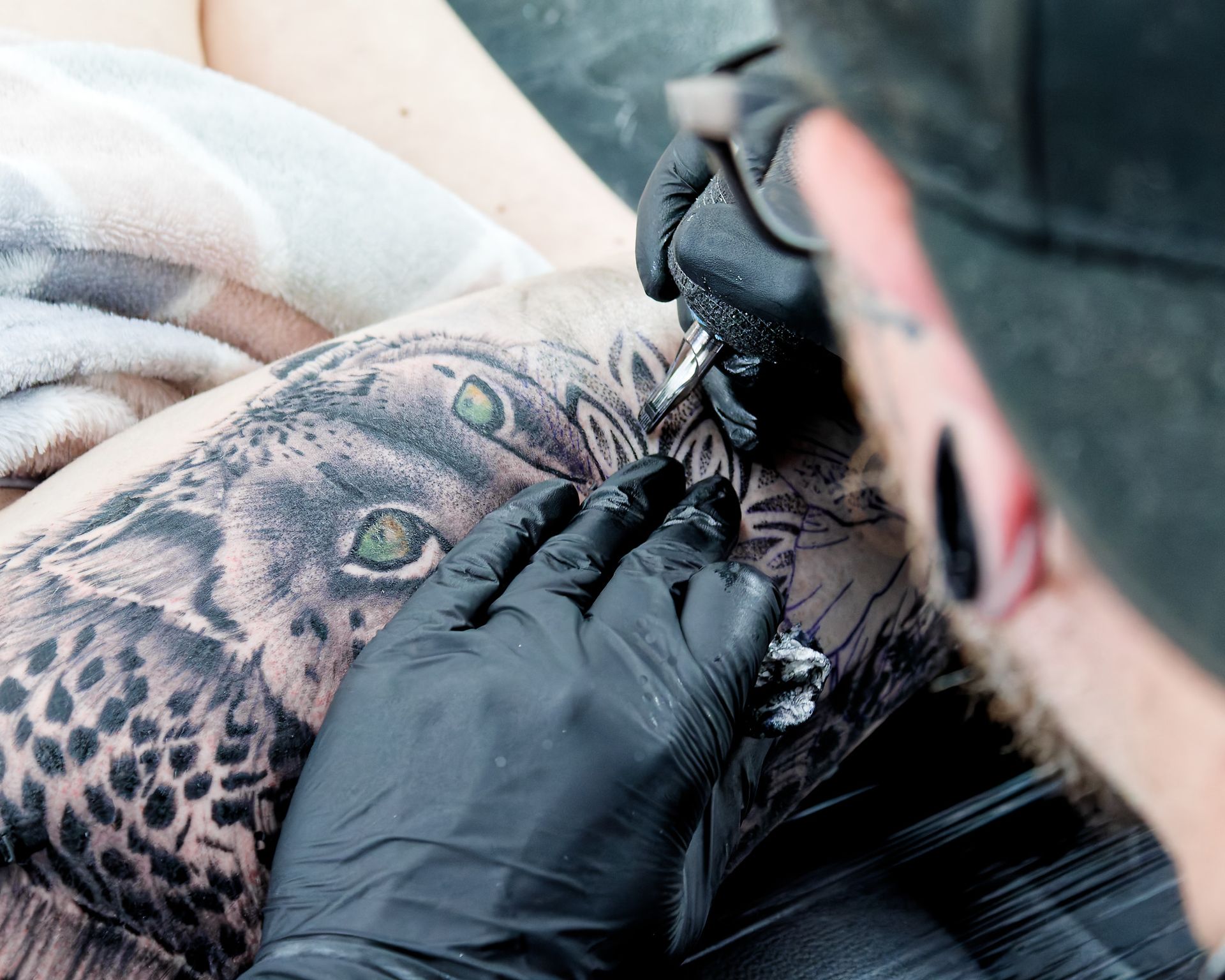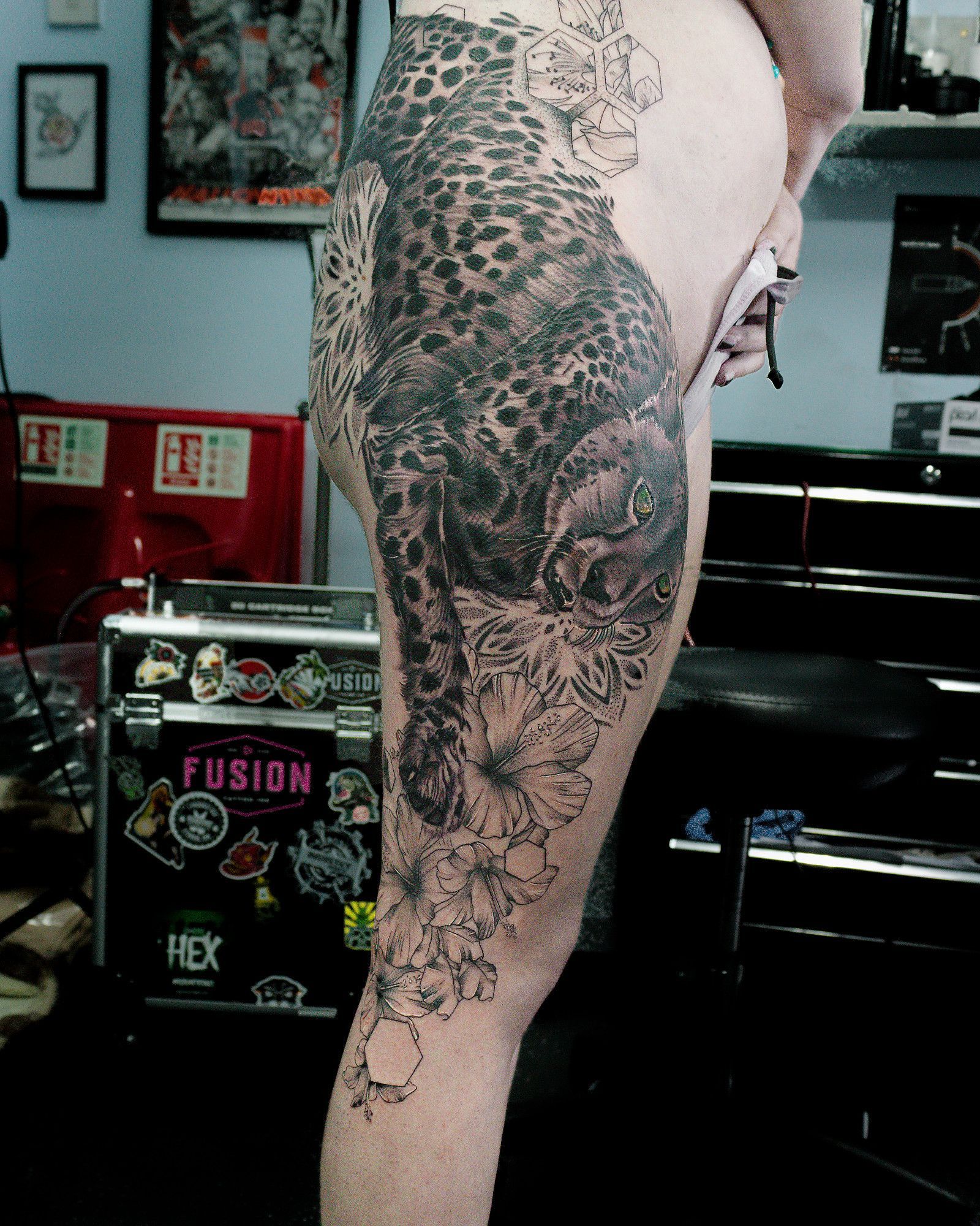 This particular piece designed by our artists Connor and Rich used ideas such as realism and blackwork, as well as geometric elements and pointillism. Connor added the twist of the green eyes of envy to bring the design to life.